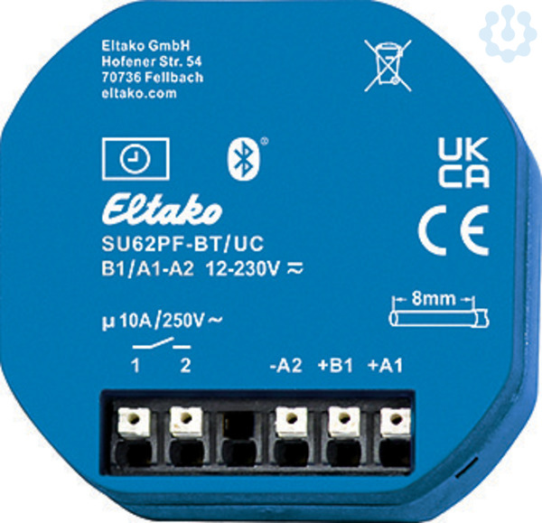 1-Kanal-Schaltuhr mit potenzialfreiem Kontakt, Bluetooth und ELTAKO Connect-App. 1 Schließer potenzialfrei 10 A/250 V AC, 230 V-LED-Lampen und ESL bis 200 W, Glühlampen 2000 W. Mit Astro-Funktion. Stand-by-Verlust nur 0,3 Watt. Für die Einbaumontage. 49 x 51 mm, 20 mm tief. Die Anschlussklemmen sind Steckklemmen für Leiterquerschnitte von 0,2 mm² bis 2,5 mm. Versorgungs- und Steuerspannung 12-230V UC. Bistabiles Relais, dadurch gibt es auch im eingeschalteten Zustand keine Spulen- Verlustleistung und keine Erwärmung hierdurch. Bis zu 60 Speicherplätze zur Programmierung von Schaltzeitpunkten. Mit Datum und automatischer Sommerzeit-/Winterzeit-Umstellung. Gangreserve ohne Batterie ca. 7 Tage. Bei Spannungswiderkehr schaltet die Schaltuhr die Programme nach. Jeder Speicherplatz kann entweder mit der Astro-Funktion (automatisches Schalten nach Sonnenaufgang bzw. -untergang) oder der Einschalt- und Ausschaltzeit belegt werden, einmalige Programmausführung konfigurierbar. Die Ein- bzw. Ausschaltzeit Astro kann bis zu ± 2 Stunden verschoben werden. Zusätzlich kann eine von den Sonnenwenden beeinflusste Zeitverschiebung von bis zu ± 2 Stunden eingegeben werden. Die Einstellung der Schaltuhr erfolgt über Bluetooth mit der ELTAKO Connect-App. Der QR-Code in der Bedienungsanleitung führt zum Download der App, mit welcher das Gerät konfiguriert wird. Kopplungsmodus: Automatisch für 3 Minuten nach dem Anlegen der Spannung oder manuell über den örtlichen Taster (5 Sekunden betätigen). Ein kurzes Ein- und Ausschalten der Last signalisiert die Kopplungsbereitschaft. Wird die Verbindung nicht über die App getrennt, wird diese nach 20 Minuten ohne Kommunikation zur App automatisch getrennt. Nachdem die Verbindung mit der App getrennt wurde, ist die Schaltuhr erneut für 3 Minuten kopplungsbereit, kann aber über den örtlichen Taster (5 Sekunden betätigen) manuell beendet werden. Das zweimalige Ein- und Ausschalten der Last signalisiert das Ende der Kopplungsbereitschaft. PIN ändern: Der PIN für die Bluetooth-Verbindung kann in der App, unter dem Eintrag Geräte-PIN geändert werden. Bluetooth-Reset (evtl. geänderten PIN löschen): Den örtlichen Taster 8-mal kurz tippen oder die Versorgungsspannung 8-mal ab- und zuschalten. Einstellen der Schaltuhr über die ELTAKO Connect-App: Programme bearbeiten: Erstellen, Bearbeiten und Aktivierung/Deaktivierung von Zeit- und Astro-Programmen, sowie die Möglichkeit, ein Programm nur einmal auszuführen. Kanal Konfiguration: Auswahl zwischen AUTO-, Ein- oder Aus-Funktion. Die Schaltuhr schaltet nur entsprechend der Zeit- und Astro-Programme, wenn die AUTO-Funktion aktiviert ist. Zufallsmodus: Bei eingeschaltetem Zufallsmodus werden alle Schaltzeitpunkte zufällig um bis zu 15 Minuten verschoben. Einschaltzeiten werden nach vorne und Ausschaltzeiten nach hinten verschoben. Zeitversatz Sonnenwende: Einstellung einer Zeitverschiebung von bis zu ± 2 Stunden bei der Sommersonnenwende und bei der Wintersonnenwende. Datum und Uhrzeit: Datum, Uhrzeit, Zeitzone und Sommer-/Winterzeit können manuell eingestellt oder automatisch durch die App ermittelt und gesetzt werden. Standort: Der Standort kann manuell eingegeben oder durch die App ermittelt und gesetzt werden. Bluetooth: Auswahl zwischen 3 Bluetooth-Einstellungen. 3min-An: Nach dem Anlegen der Spannung ist die Schaltuhr für 3 Minuten kopplungsbereit. Manuell-An: Die Kopplungsbereitschaft kann für 3 Minuten nur über den örtlichen Taster aktiviert werden. Dauer-An: Bluetooth bleibt dauerhaft aktiv Werkseinstellungen: Auswahl zwischen dem Löschen aller Programme, Zurücksetzen der Bluetooth-Einstellungen und dem Zurücksetzen auf Werkseinstellungen. Schaltuhr mit dem örtlichen Taster bedienen: Handschaltung: Durch einen kurzen Tastendruck kann manuell immer ein- und ausgeschaltet werden.