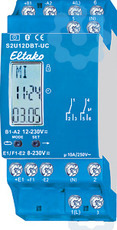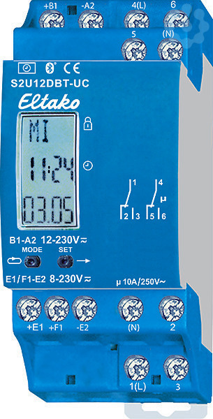 2-Kanal-Schaltuhr mit Display und Bluetooth mit der App ELTAKO Connect. 1+1 Wechsler potenzialfrei 10A/250V AC, mit DX-Technologie. Mit Displaybeleuchtung und Astro-Funktion. Stand-by Verlust nur 0,1-0,3 Watt. Versorgungsspannung 12..230V UC. Steuereingänge zentral EIN und zentral AUS für 8..230V UC, von der Versorgungsspannung und Schaltspannung galvanisch getrennt. Reiheneinbaugerät für Montage auf Tragschiene DIN-EN 60715 TH35. 2 Teilungseinheit = 36mm breit, 58mm tief. Mit der patentierten ELTAKO-Duplex-Technologie (DX) können die normalerweise potenzialfreien Kontakte beim Schalten von 230V/50Hz-Wechselspannung trotzdem im Nulldurchgang schalten und damit den Verschleiß drastisch reduzieren. Hierzu einfach den N-Leiter an die jeweilige Klemme (N) und L an 1(L) und/oder 4(L) anschließen. Dadurch ergibt sich ein zusätzlicher Standby-Verlust von je nur 0,1 Watt. Bis zu 60 Schaltuhr-Speicherplätze werden frei auf die Kanäle verteilt. Mit Datum und automatischer Sommerzeit-/Winterzeit-Umstellung. Gangreserve ohne Batterie ca. 7 Tage. Jeder Speicherplatz kann entweder mit der Astro-Funktion (automatisches Schalten nach Sonnenaufgang bzw. -untergang), der Einschalt- und Ausschaltzeit oder einer Impulsschaltzeit (Auslieferzustand 2 Sekunden) belegt werden. Die Ein- bzw. Ausschaltzeit Astro kann bis zu ± 2 Stunden verschoben werden. Zusätzlich kann eine von den Sonnenwenden beeinflusste Zeitverschiebung von bis zu ± 2 Stunden eingegeben werden. Zentralsteuerung EIN (Klemmen +E1/-E2) oder AUS (Klemmen +F1/-E2) mit Priorität im Betrieb ZEA (Automatik mit Zentralsteuerung). Die Einstellung der Schaltuhr erfolgt entweder über Bluetooth mit der App oder mit den Tasten MODE und SET. Eine Tastensperre ist möglich. Durch das 1. Drücken von MODE bzw. SET schaltet sich die Displaybeleuchtung ein. 20 Sekunden nach der letzten MODE- bzw. SET-Betätigung springt das Programm automatisch in die Normalanzeige zurück und die Displaybeleuchtung wird ausgeschaltet. Schaltuhr mit der App verbinden: SET drücken, im Display erscheint BLE (Bluetooth) und die ID der Schaltuhr. Nun kann die Verbindung mit der App hergestellt werden (Auslieferzustand PIN 123123). QR-Code auf der Bedienungsanleitung scannen, die App führt durch den Anlernvorgang. Nachdem die Verbindung zur App hergestellt wurde, erscheint BLE+ im Display. Die Tasten MODE und SET sind nun gesperrt. Nach 20 Minuten ohne Interaktion mit der Schaltuhr wird die Verbindung automatisch getrennt. PIN ändern: Der PIN für die Bluetooth-Verbindung kann in der App, unter dem Eintrag Geräte-PIN, geändert werden. Bluetooth-Reset (evtl. geänderten PIN löschen): Die Verbindung zur App muss getrennt sein. MODE und SET gleichzeitig 2 Sekunden drücken, RES blinkt im Display. Nun SET 2 Sekunden drücken, es erscheint bLE im Display. Wird mit SET bestätigt, wird der BLE-Reset ausgeführt, der PIN gelöscht und der Auslieferzustand hergestellt. Schaltuhr mit den Tasten MODE und SET einstellen: Sprache einstellen: Nach jedem Anlegen der Versorgungsspannung kann innerhalb von 10 Sekunden mit SET die Sprache gewählt und mit MODE bestätigt werden. D = deutsch, GB = englisch, F = französisch, IT = italienisch und ES = spanisch. Anschließend erscheint die Normalanzeige: Wochentag, Uhrzeit, Tag und Monat. Schnelllauf: Bei den nachfolgenden Einstellungen laufen die Zahlen schnell hoch, wenn die Eingabetaste länger gedrückt wird. Loslassen und erneut länger drücken ändert die Richtung. Uhrzeit einstellen: MODE drücken und danach bei PRG mit SET die Funktion UHR suchen und mit MODE auswählen. Bei S mit SET die Stunde wählen und mit MODE bestätigen. Ebenso bei M wie Minute verfahren. Datum einstellen: MODE drücken und danach bei PRG mit SET die Funktion DAT suchen und mit MODE auswählen. Bei J mit SET das Jahr wählen und mit MODE bestätigen. Ebenso bei M wie Monat und T wie Tag verfahren. Als letzte Einstellung in der Reihenfolge blinkt der Wochentag. Dieser kann mit SET eingestellt und mit MODE bestätigt werden. Weitere Einstellungen wie Standort für Astro-Funktion, Handschaltung EIN oder AUS, Sommer-/Winterzeit-Umstellung, Zufallsmodus, Tastensperre und Eingabe der Schaltuhrprogramme gemäß Bedienungsanleitung.