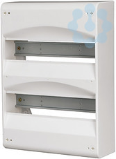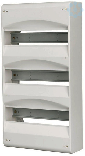 Haubenverteiler, 3-reihig, 39 TE, Schutzklasse 2, mitgelieferte Zusatzausrüstung: Kunststoffgehäuse, DIN-Schiene, Neutral- und Schutzleiterklemmen auf Klemmenträger, Rückwand, Montageanleitung, Beschriftungsbogen