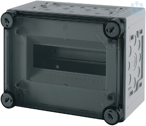 Automaten-Einzelgehäuse, Material Polycarbonat, schlagfest, Schutzart IP65, metrische Vorprägungen in allen Seitenwänden, Einbaugeräte Baugröße 1 nach DIN 43880, Deckel dursichtig mit Griffverschlüssen, Tür durchsichtig rauchgrau zum Bedienen der Einbaugeräte, Tragschienen zum Aufschnappen der Geräte, Verschlussstreifen für unbenutzte Einbauplätze, Berührungsschutzabdeckung mit Beschriftungsstreifen, PE/N-Schienen inklusive, Befestigungslaschen für Wandbefestigung, plombierbare Deckelverschlüsse, Anzahl TE=9, PE- und N-Klemmen AnzahlxQuerschnitt=je 2x(6-16)qmm und 7x(1-4)qmm, Ausführung Deckel: durchsichtig rauchgrau, Ausführung Tür: ohne