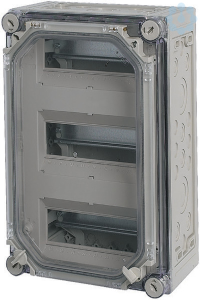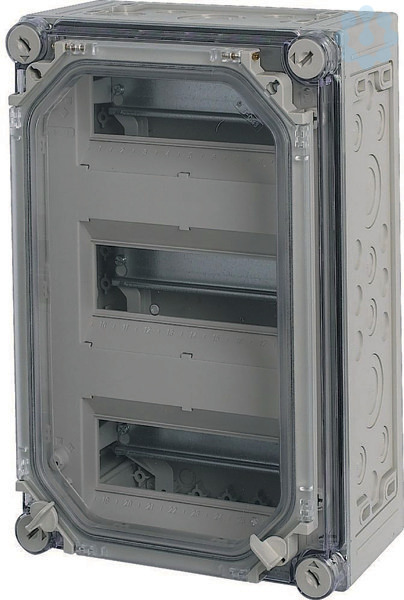 Automaten-Einzelgehäuse mit Tür, Material Polycarbonat, schlagfest, Schutzart IP65, metrische Vorprägungen in allen Seitenwänden, Einbaugeräte Baugröße 1 nach DIN 43880, Deckel dursichtig mit Griffverschlüssen, Tür durchsichtig rauchgrau zum Bedienen der Einbaugeräte, Tragschienen zum Aufschnappen der Geräte, Verschlussstreifen für unbenutzte Einbauplätze, Berührungsschutzabdeckung mit Beschriftungsstreifen, PE/N-Schienen inklusive, Befestigungslaschen für Wandbefestigung, plombierbare Deckelverschlüsse, Anzahl TE=27, PE- und N-Klemmen AnzahlxQuerschnitt=je 4x(6-35)qmm und 20x(1-4)qmm, Ausführung Deckel: durchsichtig rauchgrau, Ausführung Tür: durchsichtig rauchgrau