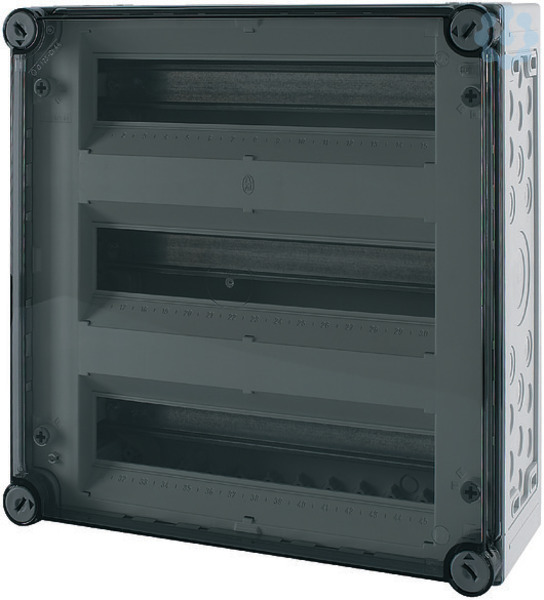 Automaten-Einzelgehäuse, Material Polycarbonat, schlagfest, Schutzart IP65, metrische Vorprägungen in allen Seitenwänden, Einbaugeräte Baugröße 1 nach DIN 43880, Deckel dursichtig mit Griffverschlüssen, Tür durchsichtig rauchgrau zum Bedienen der Einbaugeräte, Tragschienen zum Aufschnappen der Geräte, Verschlussstreifen für unbenutzte Einbauplätze, Berührungsschutzabdeckung mit Beschriftungsstreifen, PE/N-Schienen inklusive, Befestigungslaschen für Wandbefestigung, plombierbare Deckelverschlüsse, Anzahl TE=45, PE- und N-Klemmen AnzahlxQuerschnitt=je 4x(6-35)qmm und 20x(1-4)qmm, Ausführung Deckel: durchsichtig rauchgrau, Ausführung Tür: ohne