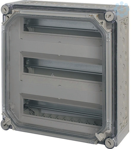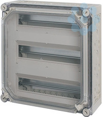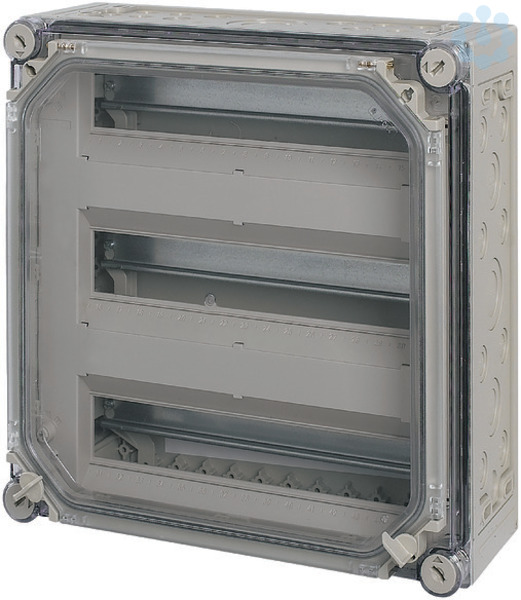 Automaten-Einzelgehäuse mit Tür, Material Polycarbonat, schlagfest, Schutzart IP65, metrische Vorprägungen in allen Seitenwänden, Einbaugeräte Baugröße 1 nach DIN 43880, Deckel dursichtig mit Griffverschlüssen, Tür durchsichtig rauchgrau zum Bedienen der Einbaugeräte, Tragschienen zum Aufschnappen der Geräte, Verschlussstreifen für unbenutzte Einbauplätze, Berührungsschutzabdeckung mit Beschriftungsstreifen, PE/N-Schienen inklusive, Befestigungslaschen für Wandbefestigung, plombierbare Deckelverschlüsse, Anzahl TE=45, PE- und N-Klemmen AnzahlxQuerschnitt=je 4x(6-35)qmm und 20x(1-4)qmm, Ausführung Deckel: durchsichtig rauchgrau, Ausführung Tür: durchsichtig rauchgrau