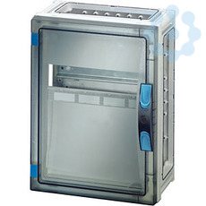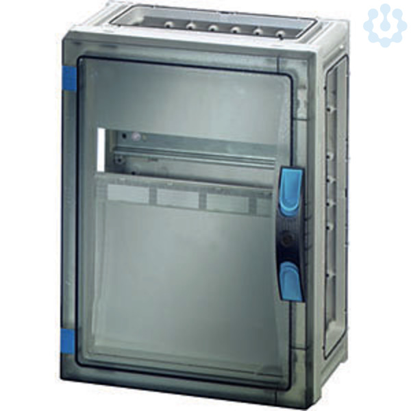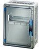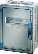 Gehäuse mit Tür für den Bau von Installationsverteilern bis 250 A für die Bedienung durch Laien nach IEC 61439-3. Offene Gehäusewände für die Kombination oder als Einzelgehäuse mit Verschlussplatten. Aus hochwertigem Polycarbonat, schutzisoliert. Schnelle Gehäuseverbindung durch Steckverbinder und integrierte Dichtungen. Große Wanddurchführungen für die elektrische Verbindung der Gehäuse untereinander. Kabeleinführung über Flansche. Wandbefestigung direkt am Gehäuse, über Außenlaschen oder mit Montageschienen. Automatengehäuse mit 12 Teilungseinheiten zum Einbau von Reiheneinbaugeräten nach DIN 43880. Für Hauptleitungsschutzschalter(SH-Schalter). Mit PE- und N-Klemmen für Kupferleiter. Mit Abdeckstreifen zum Verschließen von nicht benutzten Geräteausschnitten und Beschriftungsstreifen für die Stromkreiskennzeichnung. Abdeckung plombierbar. Transparente Tür und plombierbarer Türverschluss mit Handbetätigung.