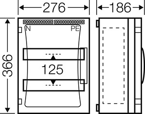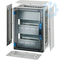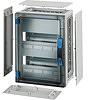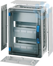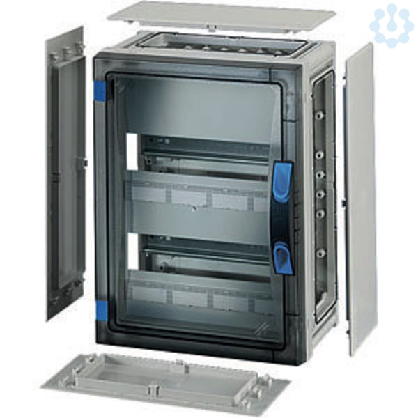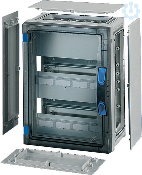 Gehäuse mit Tür für den Bau von Installationsverteilern bis 250 A für die Bedienung durch Laien nach IEC 61439-3. Offene Gehäusewände für die Kombination oder als Einzelgehäuse mit Verschlussplatten. Aus hochwertigem Polycarbonat, schutzisoliert. Schnelle Gehäuseverbindung durch Steckverbinder und integrierte Dichtungen. Große Wanddurchführungen für die elektrische Verbindung der Gehäuse untereinander. Kabeleinführung über Flansche. Wandbefestigung direkt am Gehäuse, über Außenlaschen oder mit Montageschienen. Automatengehäuse mit 24 Teilungseinheiten zum Einbau von Reiheneinbaugeräten nach DIN 43880. Mit PE- und N-Klemmen für Kupferleiter. N trennbar für unterschiedliche Potenziale. Mit Abdeckstreifen zum Verschließen von nicht benutzten Geräteausschnitten und Beschriftungsstreifen für die Stromkreiskennzeichnung. Transparente Tür und plombierbarer Türverschluss mit Handbetätigung. Mit Verschlussplatten-Set.