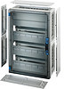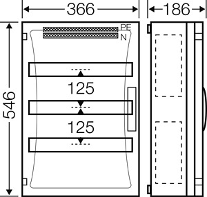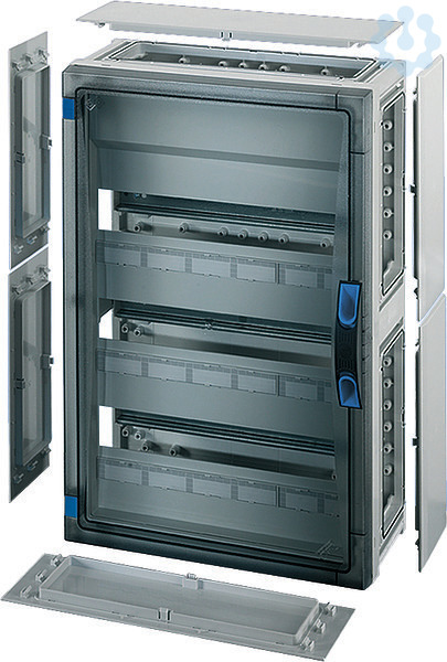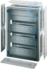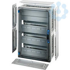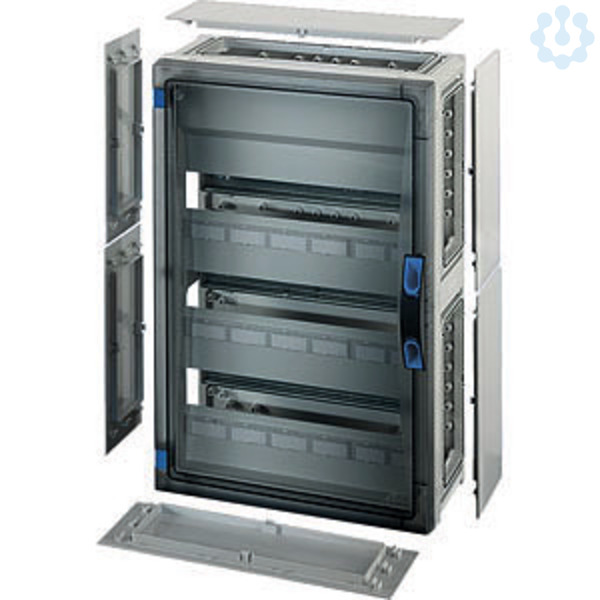 Gehäuse mit Tür für den Bau von Installationsverteilern bis 250 A für die Bedienung durch Laien nach IEC 61439-3. Offene Gehäusewände für die Kombination oder als Einzelgehäuse mit Verschlussplatten. Aus hochwertigem Polycarbonat, schutzisoliert. Schnelle Gehäuseverbindung durch Steckverbinder und integrierte Dichtungen. Große Wanddurchführungen für die elektrische Verbindung der Gehäuse untereinander. Kabeleinführung über Flansche. Wandbefestigung direkt am Gehäuse, über Außenlaschen oder mit Montageschienen. Automatengehäuse mit 51 Teilungseinheiten zum Einbau von Reiheneinbaugeräten nach DIN 43880. Mit PE- und N-Klemmen für Kupferleiter. N trennbar für unterschiedliche Potenziale. Mit Abdeckstreifen zum Verschließen von nicht benutzten Geräteausschnitten und Beschriftungsstreifen für die Stromkreiskennzeichnung. Transparente Tür und plombierbarer Türverschluss mit Handbetätigung. Mit Verschlussplatten-Set.