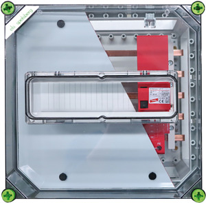 Blitzschutzgehäuse, transparent, Schutzart IP65, Schlagfestigkeit IK08, Schutzklasse II, Bemessungsspannung 400V AC, halogenfrei