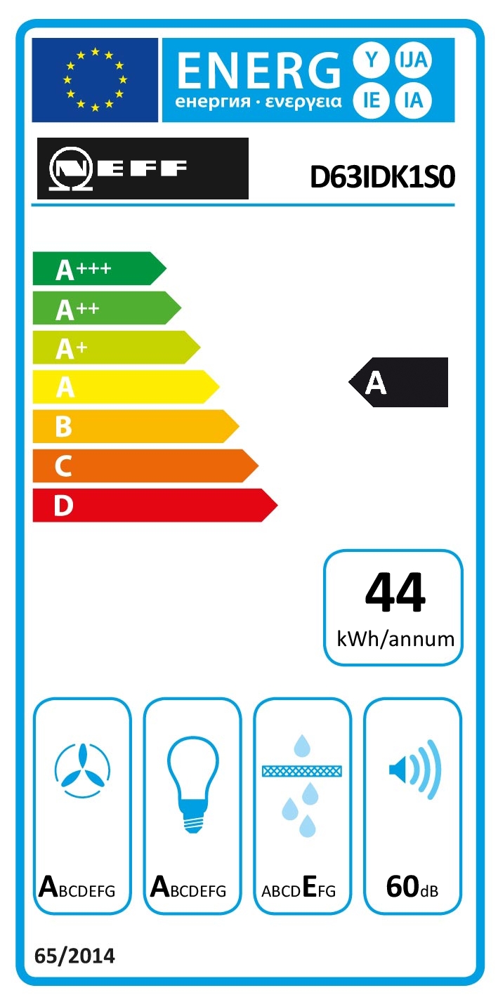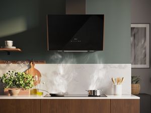 Design: Schrägessen-Design Wandmontage Glasscheibe: schwarz bedruckt Wahlweise Abluft- oder Umluftbetrieb Für Umluftbetrieb wird ein Standard Umluftset (Sonderzubehör) benötigt Wichtigste Eigenschaften: Kondensatormotor Arbeitsplatzbeleuchtung mit 2 x 3 W Farbtemperatur: 4000 K Beleuchtungsstärke: 127 lux 1 Metallfettfilter Komfortfunktionen: Elektronische Steuerung über TouchControl, hintergrundbeleuchtet 3 Leistungsstufen und 1 Intensivstufe Automatisches Zurücksetzen von Intensiv- auf Normalstufe nach 5 Min. Sättigungsanzeige für Fett - und Geruchsfilter Komfort bei der Reinigung: Die Oberflächen und Materialien sind glatt und leicht zu reinigen. Metallfettfilter, spülmaschinengeeignet Leistung Abluft: Gemäß EN 61591 und EN/IEC 60704-2-13 kann das Gerät im Abluftbetrieb folgende Werte erreichen: Leistungsstufe 1: Lüfterleistung 220 m3/h; Geräuschwert 46 dB(A) re1pW Leistungsstufe 2: Lüfterleistung 315 m3/h; Geräuschwert 53 dB (A) re1pW Leistungsstufe 3: Lüfterleistung 430 m3/h; Geräuschwert 60 dB (A) re1pW Intensivstufe 1: Lüfterleistung 550 m3/h; Geräuschwert 65 dB (A) re1pW Energieeffizienzklasse: A (auf einer Energieeffizienzklassen-Skala von A+++ bis D) Durchschnittlicher Energieverbrauch: 43.8 kWh/Jahr* Lüfter-Effizienzklasse: A* Beleuchtungs-Effizienzklasse: A* Fettfilter-Effizienzklasse: E* Leistung Umluft: Gemäß EN 61591 und EN/IEC 60704-2-13 kann Ihr Gerät im Umluftbetrieb mit dem standardmäßigen Umluftset (als optionales Zubehör erhältlich) folgende Werte erreichen: Leistungsstufe 1: Lüfterleistung 215 m3/h; Geräuschwert 51 dB(A) re1pW Leistungsstufe 2: Lüfterleistung 300 m3/h; Geräuschwert 61 dB(A) re1pW Leistungsstufe 3: Lüfterleistung 445 m3/h ; Geräuschwert 69 dB(A) re1pW Intensivstufe 1: Lüfterleistung 550 m3/h; Geräuschwert 72 dB (A) re1pW Technische Daten und Nachhaltigkeit: Angaben zum Verbrauch: Gesamtanschlusswert: 223 W Spannung: 220 - 240 V Informationen zur Planung und Installation: Gerätemaße Abluft (HxBxT): 690-900 x 590 x 325 mm Gerätemaße Umluft (HxBxT): 720-975 x 590 x 325 mm Abluftausgang: Ø 150 mm Länge Anschlusskabel: 1.5 m mit Stecker Lieferung mit Rückstauklappe