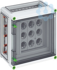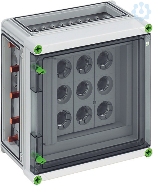 DIAZED(R)-Reiter-Sicherungsgehäuse, 3 x 3-polige DIII-Reiter-Sicherungssockel, E 33-Gewinde, Bemessungsstrom 63 A, Schraubanschluss 1,5-25mm², auf Sammelschiene 5-polig, mit 5 Sammelschienenklemmen 4-35mm², N-Klemmen 1,5-16mm², PE-Klemmen 1,5-16mm², 3 x Gehäuseverbinder (GGV), auf Sammelschienensystem 250 A, mit transparenter Klapptür