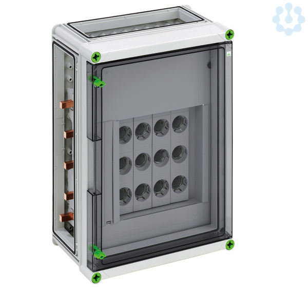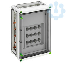DIAZED®-Reitersicherungsgehäuse GSD 324-KT-250 Plus, DIAZED®-Reiter-Sicherungsgehäuse mit zusätzlichem Anschlussraum - Industrie Qualität -, 8 x 3-polige DII-Reiter-Sicherungssockel, E 27-Gewinde, Bemessungsstrom 25 A, Schraubanschluss 1,5 - 25 mm², auf Sammelschiene 5-polig, N-Klemmen 1,5 - 16 mm², PE-Klemmen 1,5 - 16 mm², 3 x Gehäuseverbinder (GGV), Schutzart IP65, Schlagfestigkeit IK08, Schutzklasse II, Ui=500VAC, Halogenfrei, 320 x 440 x 179, auf Sammelschienensystem 250 A, mit transparenter Klapptür,