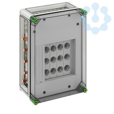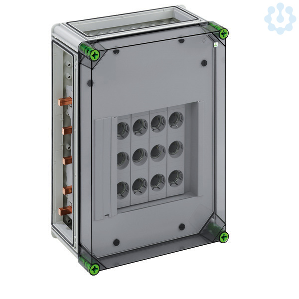 DIAZED®-Reitersicherungsgeh. GSD 324-250 Plus, DIAZED®-Reiter-Sicherungsgehäuse mit zusätzlichem Anschlussraum - Industrie Qualität -, 4 x 3-polige DII-Reiter-Sicherungssockel, E 27-Gewinde, Bemessungsstrom 25 A, Schraubanschluss 1,5 - 25 mm², auf Sammelschiene 5-polig, N-Klemmen 1,5 - 16 mm², PE-Klemmen 1,5 - 35 mm², 3 x Gehäuseverbinder (GGV), Schutzart IP65, Schlagfestigkeit IK08, Schutzklasse II, Ui=500VAC, Halogenfrei, 320 x 440 x 179, auf Sammelschienensystem 250 A, mit transparentem Deckel,
