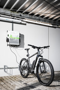 E-Bike Ladestation, Schutzart IP54, max. Leiterquerschnitt 4², Schlagfestigkeit IK08, Schutzklasse II, Bemessungsspannung 230V AC, halogenfrei