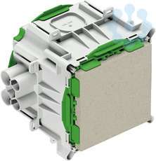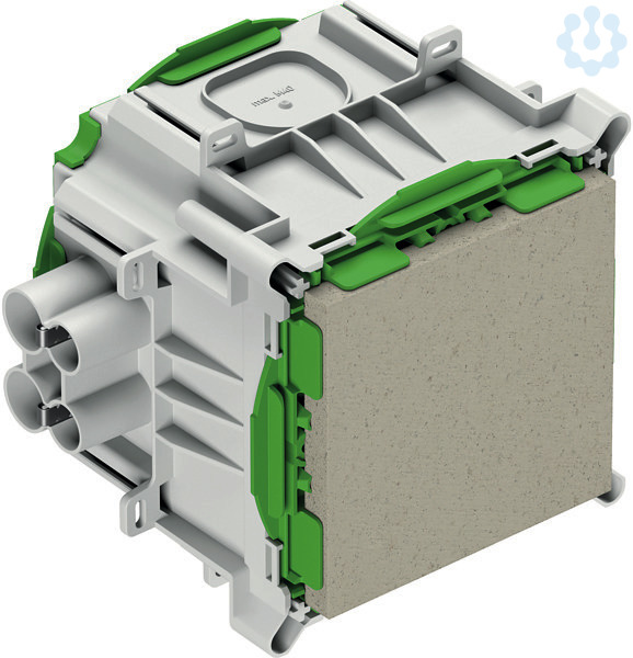 Einbaugehäuse, für Fertigteilbau, halogenfrei, zum Einbau von NV/HV/LED-Leuchten und Lautsprechern, Melde- und Rufsystemen, für die Installation von VDE geprüften Leuchten nach DIN EN 60598 (VDE 0711), sowie mit F-Kennzeichnung oder MM-Kennzeichnung, mit Schutzart IP30, Bemessungsisolationsspannung: 400V AC, halogenfrei, maximale Einbauhöhe für Leuchten, Lautsprecher, Melde und Rufsystemen: 100mm, Lampenleistung LED max. 15 W, Lampenleistung Halogen max. 25 W, Auslassöffnung: Fermacell(R)-Platte, variabel bis max. 100 x 100mm, 8 Kombi-Rohr-Einführungen 4 x 16mm, 4 x 19mm integrierte Rohrstopper und Zugentlastung für Rohre 16mm, 19mm, Klebebefestigung oder Nagelbefestigung, Kombirohreinführungen und Membran zum Lochen, Dichtbereich M16-M40