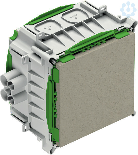 Einbaugehäuse, für Fertigteilbau, halogenfrei, zum Einbau von NV/HV/LED-Leuchten und Lautsprechern, Melde- und Rufsystemen, für die Installation von VDE geprüften Leuchten nach DIN EN 60598 (VDE 0711), sowie mit F-Kennzeichnung oder MM-Kennzeichnung, mit Schutzart IP30, Bemessungsisolationsspannung: 400V AC, halogenfrei, maximale Einbauhöhe für Leuchten, Lautsprecher, Melde und Rufsystemen: 100mm, Lampenleistung Halogen max. 50 W, Lampenleistung LED max. 20 W, Auslassöffnung: Fermacell(R)-Platte, variabel bis max. 150 x 150mm, 8 Kombi-Rohr-Einführungen 4 x 16mm, 4 x 19mm integrierte Rohrstopper und Zugentlastung für Rohre 16mm, 19mm, Klebebefestigung oder Nagelbefestigung, Kombirohreinführungen und Membran zum Lochen, Dichtbereich M16-M40