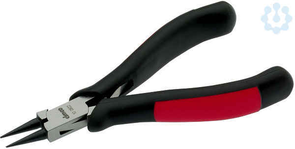Elektronik-Rundzange, 130 mm kurze Form, glatte Backen, Spitze 1,5 mm Durchmesser, Präzisions-Elektronikzangen mit durchgestecktem Gelenk, gesenkgeschmiedete Ausführung hochpräzise Ausführung aus Spezialstahl, leicht selbstöffnend durch Doppelblattfedern, hohe Standzeit, Flächen fein geschliffen, mit ergonomischen Zwei-Komponenten Griffhüllen (in ESD oder 1.000 V Ausführung auf Anfrage)