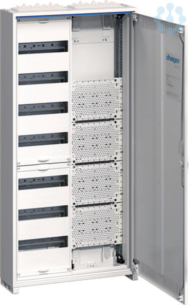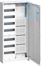 Feldverteiler AP,univers,IP31,SKII,84PLE+Mediafeld,m.geschl.Tür,1100x550x161,QC.Feldverteiler nach DIN EN 61 439-1/-3, Maßnorm DIN 43 870. Zum Einbau für Geräte bis 125 A, Luft- und Kriechstrecken nach DIN EN 60664-1. Bestehend aus Schrank mit geschlitzter Blechtür aus pulverbeschichtetem und eingebranntem Stahlblech. Ab Schrankbreite 800 mm (3-feldig) zwei türiger Aufbau. Rechte Türen maximal 2-feldig breit. Komplettschrank mit Einbausatz links bestückt mit profilierten Tragschienen, 7,5 mm hohen Hutschienen in 125 mm Mittenabstand und passenden Berührungsschutzabdeckungen, inklusiv PE/N-QuickConnect-Klemmen auf Träger montiert, und mit Multimediafeld rechts bestückt mit Kunststoffplatten auf profilierten Tragschienen ohne Berührungsschutzabdeckungen. Innerer Berührungsschutz (SKII) aus Kunststoff, Leitungseinführungen oben/unten durch herausnehmbare Kunststoffflanschplatten und durchgehende vertikale Abschottung zwischen Multimedia und Energiefeld. Tür mit innenliegenden justierbaren Scharnieren und einem Öffnungswinkel von 130°. Türen rechts und links anschlagbar. Türverschluss serienmäßig mit Dreipunkt-Stangenverschluss (ab Schrankbreite 800 mm) und Klappgriff plombierbar. Austauschbare Schließsysteme siehe Zubehör.