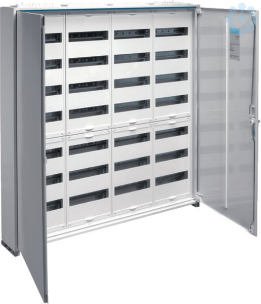 Feldvert. AP, univ., IP44, SKII, 336PLE, 4x7 Reihen, 1100X1050x161mm, o. Klemme.Feldverteiler nach DIN EN 61 439-1/-3, Maßnorm nach DIN 43 870. Zum Einbau für Geräte bis 125 A, Luft- und Kriechstrecken nach DIN EN 60664-1. Bestehend aus Schrank mit Tür aus pulverbeschichtetem und eingebranntem Stahlblech. Ab Schrankbreite 800 mm (3-feldig) zwei türiger Aufbau. Rechte Türen maximal 2-feldig breit. Komplettschrank mit Einbausatz bestückt mit profilierten Tragschienen, 7,5 mm hohen Hutschienen in 125 mm Mittenabstand und passenden Berührungsschutzabdeckungen, ohne PE/N-QuickConnect-Klemmen und ohne Träger. Leitungseinführungen oben/unten durch herausnehmbare flexiblen Kunststoffflanschplatten, zusätzlich austauschbar. Tür mit innenliegenden justierbaren Scharnieren und einem Öffnungswinkel von 110°. Türen rechts und links anschlagbar, werkzeugloser wechselbar Türanschlag. Türverschluss serienmäßig mit Dreipunkt-Stangenverschluss und plombierbaren Klappgriff. Austauschbare sperrbare Schließsysteme und Türen, siehe Zubehör.