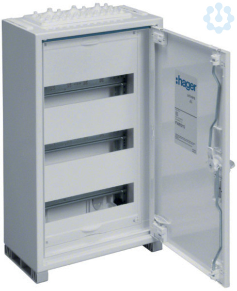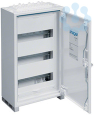 Feldvert. AP, univers, IP44, SKII, 36PLE, 1x3 Reihen 500x300x161mm, ohne Klemme.Feldverteiler nach DIN EN 61 439-1/-3, Maßnorm nach DIN 43 870. Zum Einbau für Geräte bis 125 A, Luft- und Kriechstrecken nach DIN EN 60664-1. Bestehend aus Schrank mit Tür aus pulverbeschichtetem und eingebranntem Stahlblech. Ab Schrankbreite 800 mm (3-feldig) zwei türiger Aufbau. Rechte Türen maximal 2-feldig breit. Komplettschrank mit Einbausatz bestückt mit profilierten Tragschienen, 7,5 mm hohen Hutschienen in 125 mm Mittenabstand und passenden Berührungsschutzabdeckungen, ohne PE/N-QuickConnect-Klemmen und ohne Träger. Leitungseinführungen oben/unten durch herausnehmbare flexiblen Kunststoffflanschplatten, zusätzlich austauschbar. Tür mit innenliegenden justierbaren Scharnieren und einem Öffnungswinkel von 110°. Türen rechts und links anschlagbar, werkzeugloser wechselbar Türanschlag. Türverschluss serienmäßig mit Dreipunkt-Stangenverschluss und plombierbaren Klappgriff. Austauschbare sperrbare Schließsysteme und Türen, siehe Zubehör.