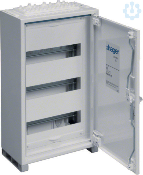 Feldvert. AP, univers, IP44, SKII, 36PLE, H:500xB:300xT:161mm, QuickConnect.Feldverteiler nach DIN EN 61 439-1/-3, Maßnorm nach DIN 43 870. Zum Einbau für Geräte bis 125 A, Luft- und Kriechstrecken nach DIN EN 60664-1. Bestehend aus Schrank mit Tür aus pulverbeschichtetem und eingebranntem Stahlblech. Ab Schrankbreite 800 mm (3-feldig) zwei türiger Aufbau. Rechte Türen maximal 2-feldig breit. Komplettschrank mit Einbausatz bestückt mit profilierten Tragschienen, 7,5 mm hohen Hutschienen in 125 mm Mittenabstand und passenden Berührungsschutzabdeckungen, inklusiv PE/N-QuickConnect-Klemmen auf Träger montiert. Leitungseinführungen oben/unten durch herausnehmbare flexiblen Kunststoffflanschplatten, zusätzlich austauschbar. Tür mit innenliegenden justierbaren Scharnieren und einem Öffnungswinkel von 110°. Türen rechts und links anschlagbar, werkzeugloser wechselbar Türanschlag. Türverschluss serienmäßig mit Dreipunkt-Stangenverschluss und plombierbaren Klappgriff. Austauschbare sperrbare Schließsysteme und Türen, siehe Zubehör.