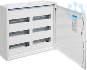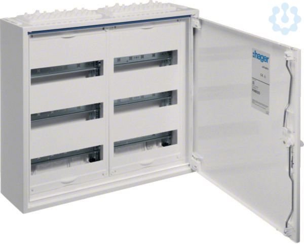 Feldvert. AP, univers, IP44, SKII, 72PLE, 2x3Reihen 500x550x161mm, ohne Klemme.Feldverteiler nach DIN EN 61 439-1/-3, Maßnorm nach DIN 43 870. Zum Einbau für Geräte bis 125 A, Luft- und Kriechstrecken nach DIN EN 60664-1. Bestehend aus Schrank mit Tür aus pulverbeschichtetem und eingebranntem Stahlblech. Ab Schrankbreite 800 mm (3-feldig) zwei türiger Aufbau. Rechte Türen maximal 2-feldig breit. Komplettschrank mit Einbausatz bestückt mit profilierten Tragschienen, 7,5 mm hohen Hutschienen in 125 mm Mittenabstand und passenden Berührungsschutzabdeckungen, ohne PE/N-QuickConnect-Klemmen und ohne Träger. Leitungseinführungen oben/unten durch herausnehmbare flexiblen Kunststoffflanschplatten, zusätzlich austauschbar. Tür mit innenliegenden justierbaren Scharnieren und einem Öffnungswinkel von 110°. Türen rechts und links anschlagbar, werkzeugloser wechselbar Türanschlag. Türverschluss serienmäßig mit Dreipunkt-Stangenverschluss und plombierbaren Klappgriff. Austauschbare sperrbare Schließsysteme und Türen, siehe Zubehör.