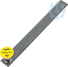 Flachstahl-Erdungsbrücke nach Richtline der DB Netz AG Ril 997.0205A01, zur Erdung, Rückstromführung sowie dem Potentialausgleich im Nutzungsbereich von Bahnstrecken. Bestehend aus Anschlussplatte aus NIRO mit Anschlussgewinde M16 und Flachstahl. Ausgelegt für Kurzschlussströme > 25 kA.