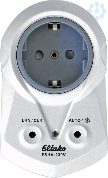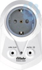 1 Schließer nicht potenzialfrei 10A/250V AC. Verschlüsselter Funk, bidirektionaler Funk und Repeater-Funktion zuschaltbar. Stand-by-Verlust nur 0,8 Watt. Zwischenstecker für deutsche Schutzkontakt-Steckdose. Mit erhöhtem Berührungsschutz. Versorgungs- und Schaltspannung 230V. Kontaktschaltung im Nulldurchgang. Beim Ausfall der Versorgungsspannung bleibt der Schaltzustand erhalten. Bei wiederkehrender Versorgungsspannung wird definiert ausgeschaltet. Der FSHA wertet die Informationen von Funk-Temperaturreglern oder -fühlern aus. Eventuell ergänzt um Fenster-Tür-Kontakte, Fenstergriffe, Bewegungsmelder und Funktaster. Nach dem Einstecken die automatische kurze Synchronisation abwarten, bevor der geschaltete Verbraucher eingesteckt wird. Es können verschlüsselte Sensoren eingelernt werden. Es kann bidirektionaler Funk und/oder eine Repeater-Funktion eingeschaltet werden. Jede Zustandsänderung wird dann mit einem Funk-Telegramm bestätigt. Dieses Funk-Telegramm kann in andere Aktoren und im Controller eingelernt werden. Der FSHA arbeitet als Zweipunkt-Regler: Bei Ist-Temperatur > = Soll-Temperatur wird ausgeschaltet. Bei Ist-Temperatur < = (Soll-Temperatur – Hysterese) wird eingeschaltet. Die Hysterese ist mit 1° festgelegt. Grundsätzlich ist die Frostschutzfunktion aktiv. Sobald die Ist-Temperatur unter 8°C fällt, wird auf 8°C geregelt. Solange ein oder mehrere Fenster offen sind, bleibt der Ausgang aus, sofern Fenster/Tür-Kontakte oder Fenstergriffe eingelernt wurden. Der Frostschutz bleibt jedoch aktiv. Solange alle eingelernten Bewegungsmelder keine Bewegung gemeldet haben, wird auf Absenkbetrieb geschaltet und die Soll-Temperatur wird um 2° abgesenkt. Sobald ein Bewegungsmelder wieder Bewegung meldet, wird auf Normalbetrieb geschaltet. Ist ein Funktaster eingelernt, so sind die 4 Tasten fest mit folgenden Funktionen belegt: Rechts oben: Normalbetrieb (AUTO), auch per Schaltuhr aktivierbar. Rechts unten: Nachtabsenkbetrieb um 4°, auch per Schaltuhr aktivierbar. Links oben: Absenkbetrieb um 2°. Links unten: Aus (Frostschutz aktiv). Sind gleichzeitig Bewegungsmelder und Funktaster eingelernt, so gilt immer das zuletzt empfangene Telegramm. Ein Bewegungsmelder schaltet bei Bewegung folglich einen mit dem Funktaster gewählten Absenkbetrieb wieder aus. Störbetrieb: Wird länger als 1 Stunde kein Funktelegramm eines Temperatursensors empfangen, leuchtet die LED und es wird auf Störbetrieb geschaltet. Der FSHA-230V schaltet zyklisch für 4,5 Minuten ein und für 10,5 Minuten aus. Wird wieder ein Funktelegramm empfangen, erlischt die LED und es wird automatisch wieder auf Normalbetrieb geschaltet. Die LED begleitet den Einlernvorgang und zeigt im Betrieb Funk-Steuerbefehle durch kurzes Aufblinken an.