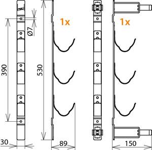 Haltevorrichtung Set für 3 HH-Sicherungen und Sicherungszange. Bohrungen Ø7 mm für einfache Wandmontage.