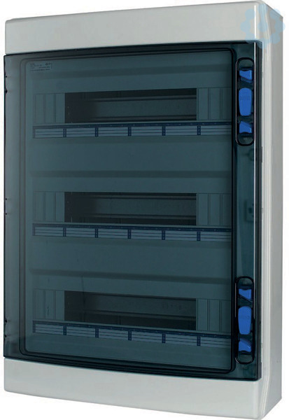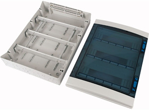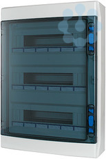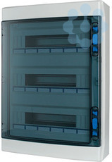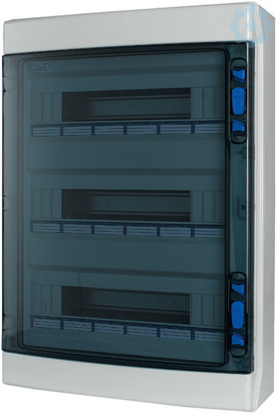 IKA Feuchtraumkleinverteiler RAL7035, mit Neutral- und Schutzleiterklemme, CNC geschäumte Dichtung für Schutzart IP65 nach IEC/EN 62208, 54 Teilungseinheiten, 3-reihig, UV stabil nach DIN EN ISO 4892-2, für den Bau von Installationsverteilern nach IEC/EN 61439-3 VDE 0660-600-3 zugelassen, integrierte Modulkompensation für unterschiedliche Gerätebreiten, metrische Leitungsvorprägungen mit Zentrierungspunkt, Gehäuse komplett aus Polycarbonat (UV-beständig), zum Einbau von Schalt- und Schutzgeräten nach Maßnorm DIN 43 880 mit 70 mm oder 85 mm Einbautiefe, AC 1000 V, DC 1500 V, RoHs-konform, Bestehend aus Kunststoffunterteil mit herausnehmbaren Hutprofilschienengerüst aus verzinktem Stahlblech, Hutschiene tiefenverstellbar in 2 Positionen, direkt Montage Wandbefestigungslöcher, fingersichere Neutral- und Schutzleiterklemme IP2X, Vorprägung für metrische Leitungseinführungen oben und unten, seitliche Vorprägungen für Verbindungselemente zur Verbindung von zwei oder mehreren Gehäusen nebeneinander, Oberteil mit 46 mm Geräteöffnung, transparente Tür frontbündig, rechts oder links anschlagbar, Türanschlag nachträglich einfach vor Ort wechselbar ohne das Gehäuseoberteil zu entnehmen, Gehäuseoberteil mit plombierbaren Schnellverschlüssen, Tür abschließbar mit Zubehör LOCK-KIT-IKA, Tür plombierbar, inklusive Leerplatzabdeckung und Beschriftungsstreifen.