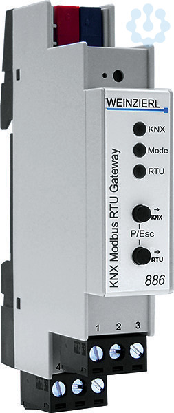 Kompaktes Gateway zwischen KNX TP und Modbus RTU mit 250 frei konfigurierbaren Kanälen. Schutzart IP 20. Reihenbaugerät für Montage auf Tragschiene DIN-EN 60715 TH35. 1 Teilungseinheit = 18mm breit, 58mm tief. Das Gerät ermöglicht eine einfache Integration von Modbus-Geräten, die das RTU-Protokoll über RS485 unterstützen und kann als Modbus-Master oder -Slave fungieren. Als Master kann das Gerät bis zu 25 Slave-Geräte adressieren. Die Zuordnung zwischen KNX-Objekten und Modbus-Registern kann über Parameter in der ETS konfiguriert werden. Es ist keine weitere Software erforderlich. Der KNX Bus und Modbus sind galvanisch voneinander getrennt. Zwei Taster und drei LEDs ermöglichen eine lokale Bedienung und eine Visualisierung des Gerätezustands.