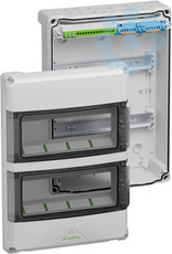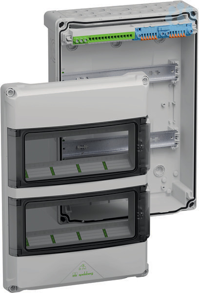 Kleinverteiler, mit Schutzart IP65, 2-reihig, 24 verfügbare Teilungseinheiten, Bemessungsbetriebsspannung: 400V AC, Bemessungsisolationsspannung: 1000V AC, 1500V DC, oben selbstdichtende, weiche Einführungsmembranen zur werkzeuglosen Leitungseinführung, unten metrische Vorprägungen für universelle Leitungseinführungen mit Kabelverschraubungen und / oder Doppelmembranstutzen, für die Standardinstallation im Innenbereich, grau, PE/N-Klemme, bestehend aus: PE-Klemmschiene mit 3 Schraubklemmen 2,5-16mm² und 14 Push-in-Klemmen 0,75-4mm², 2 N-Module (mit Steckbrücke verbunden) mit jeweils 2 Schraubklemmen 2,5-16mm² und 6 Push-in-Klemmen 0,75-4mm² mit Betätigungshebel zum werkzeuglosen Lösen der Leiter