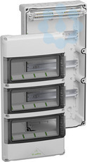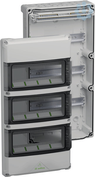 Kleinverteiler, mit Schutzart IP65, 3-reihig, 36 verfügbare Teilungseinheiten, Bemessungsbetriebsspannung: 400V AC, Bemessungsisolationsspannung: 1000V AC, 1500V DC, oben selbstdichtende, weiche Einführungsmembranen zur werkzeuglosen Leitungseinführung, unten metrische Vorprägungen für universelle Leitungseinführungen mit Kabelverschraubungen und / oder Doppelmembranstutzen, für die Standardinstallation im Innenbereich, grau, PE/N-Klemmschiene mit Schraubklemmen: PE mit 4 Klemmstellen 2,5-16mm² und 30 Klemmstellen 0,75-6mm², N mit 2 N-Potentialen mit je 2 Klemmstellen 2,5-16mm² und 10 Klemmstellen 0,75-6mm²
