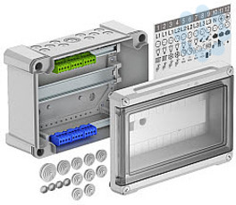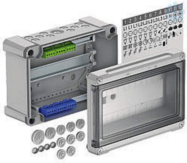 Kleinverteiler mit Klemmleiste zur Aufputz-Montage, für die Strom-Unterverteilung im Innen- und geschützten Außenbereich, gemäß IEC 439-3. Mit vormontierter 35-mm-Hutprofilschiene. Schutzart IP66 und Schutzgrad IK07. Transparenter Deckel zum Schrauben, mit Ausschnitt.