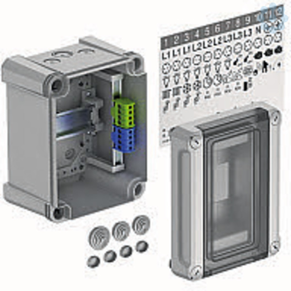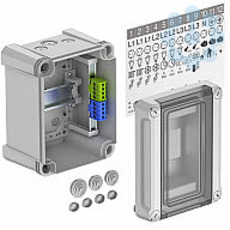 Kleinverteiler mit Klemmleiste zur Aufputz-Montage, für die Strom-Unterverteilung im Innen- und geschützten Außenbereich, gemäß IEC 439-3. Mit vormontierter 35-mm-Hutprofilschiene. Schutzart IP66 und Schutzgrad IK07. Transparenter Deckel zum Schrauben, mit Ausschnitt.