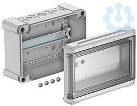 Kleinverteiler zur Aufputz-Montage, für die Strom-Unterverteilung im Innen- und Außenbereich, gemäß IEC 439-3. Mit vormontierter 35-mm-Hutprofilschiene. Schutzart IP66 und Schutzgrad IK08. Transparenter Deckel zum Schrauben, mit Ausschnitt. Inklusive 4 Schraubenabdeckkappen.