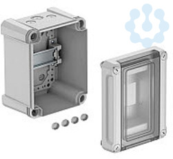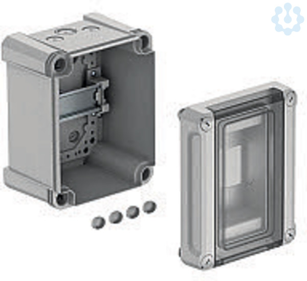 Kleinverteiler zur Aufputz-Montage, für die Strom-Unterverteilung im Innen- und Außenbereich, gemäß IEC 439-3. Mit vormontierter 35-mm-Hutprofilschiene. Schutzart IP66 und Schutzgrad IK08. Transparenter Deckel zum Schrauben, mit Ausschnitt. Inklusive 4 Schraubenabdeckkappen.