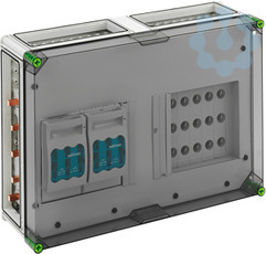 Kombi-Reitergehäuse mit zusätzlichem Anschlussraum, 2 x NH 00-Reiter-Sicherungs-Lasttrennschalter, Bemessungsstrom 125 A, Schellenanschluss 1,5-70mm², Abgang oben, 5 x 3-polige D02-Reiter-Sicherungssockel, E 18-Gewinde, Bemessungsstrom 63 A, Schraubanschluss 1,5-25mm², auf Sammelschiene 5-polig, mit 5 Sammelschienenklemmen 16-70mm², N-Klemmen 4-35mm², PE-Klemmen 4-35mm², N-Klemmen 1,5-16mm², PE-Klemmen 1,5-16mm², 4 x Gehäuseverbinder (GGV), auf Sammelschienensystem 250 A, mit transparentem Deckel