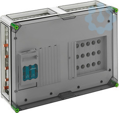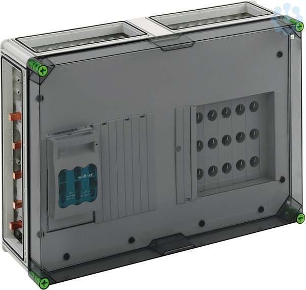 Kombi-Reitergehäuse mit zusätzlichem Anschlussraum, 1 x NH 00-Reiter-Sicherungs-Lasttrennschalter, Bemessungsstrom 125 A, Schellenanschluss 1,5-70mm², Abgang oben, 5 x 3-polige D02-Reiter-Sicherungssockel, E 18-Gewinde, Bemessungsstrom 63 A, Schraubanschluss 1,5-25mm², auf Sammelschiene 5-polig, mit 5 Sammelschienenklemmen 16-70mm², N-Klemme 4-35mm², PE-Klemme 4-35mm², N-Klemmen 1,5-16mm², PE-Klemmen 1,5-16mm², 4 x Gehäuseverbinder (GGV), auf Sammelschienensystem 250 A, mit transparentem Deckel