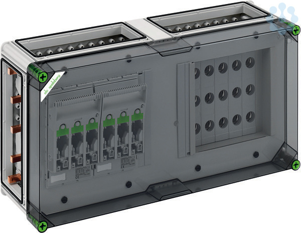 Kombi-Reitergehäuse, 2 x NH 00-Reiter-Sicherungs-Lasttrennschalter, Schellenanschluss 1,5-50mm², Abgang universal, 5 x 3-polige D02-Reiter-Sicherungssockel, E 18-Gewinde, Schraubanschluss 1,5-25mm², auf Sammelschiene 5-polig, mit 5 Sammelschienenklemmen zum direkten Anschluss eines Kabels an das Sammelschienensystem, zusätzliche N- und PE-Klemme für jeden Trennschalter, 4 x Gehäuseverbinder (GGV), Sammelschienensystem 250 A, mit transparentem Deckel