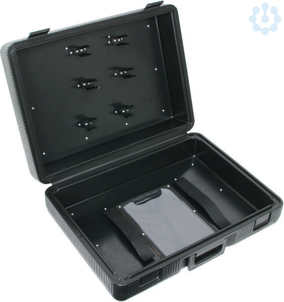 Kunststoffkoffer, leer, mit Halteklammern für zweiteilige Erdungsstange und Erdungs- und Kurzschließvorrichtung.