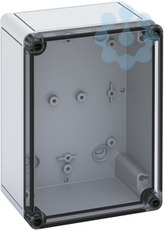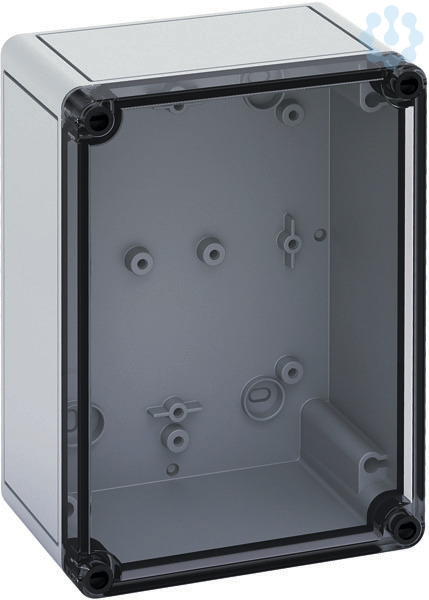 Leergehäuse, mit Schutzart IP66, Polycarbonat, glasfaserverstärkt, zertifiziert durch UL (UL 50 & CSA 22.2 No. 94.1-07, UL 50E & CSA C22.2 No. 94.2-07), DLG (Ammoniakbeständigkeit), DNV (Klasse: Schiffe & Offshore-Anlagen), Ui=690V AC, Ui=1000V DC, innenliegende Befestigungsstellen, für Installationen im industriellen Umfeld und geschütztem Außenbereich, Kasten: Polycarbonat, glasfaserverstärkt, grau, Deckel: Polycarbonat, transparent, glatte Seitenwände