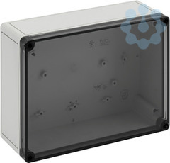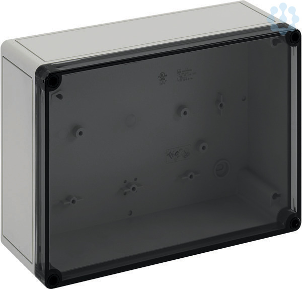 Leergehäuse, mit Schutzart IP66, Polycarbonat, glasfaserverstärkt, zertifiziert durch UL (UL 50 & CSA 22.2 No. 94.1-07, UL 50E & CSA C22.2 No. 94.2-07), DLG (Ammoniakbeständigkeit), DNV (Klasse: Schiffe & Offshore-Anlagen), Ui=690V AC, Ui=1000V DC, innenliegende Befestigungsstellen, für Installationen im industriellen Umfeld und geschütztem Außenbereich, Kasten: Polycarbonat, glasfaserverstärkt, grau, Deckel: Polycarbonat, transparent, glatte Seitenwände