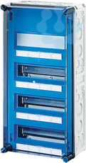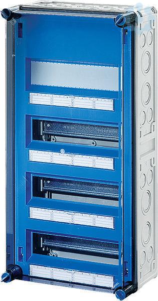 Gehäuse für den Bau von Energie-Schaltgerätekombinationen bis 630 A oder als Einzelgehäuse. Aus hochwertigem Polycarbonat schutzisoliert. Wanddurchführungen mit großen Öffnungen für die elektrische Verbindung der Gehäuse untereinander. Kabeleinführung an allen Gehäusewänden über metrische Vorprägungen oder Anbauflansche. Gehäuse zur Wandbefestigung auch über Außenlaschen oder mit Montageschienen. Automatengehäuse mit 36 Teilungseinheiten zum Einbau von Reiheneinbaugeräten nach DIN 43880. Mit zusätzlicher DIN-Trageschiene für Geräteeinbautiefe 72 mm. Ohne PE- und N-Klemmen. Mit Abdeckstreifen zum Verschließen von nicht benutzten Geräteausschnitten und Beschriftungsstreifen für die Stromkreiskennzeichnung. Transparenter Deckel, Deckelverschlüsse für Handbetätigung.
