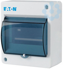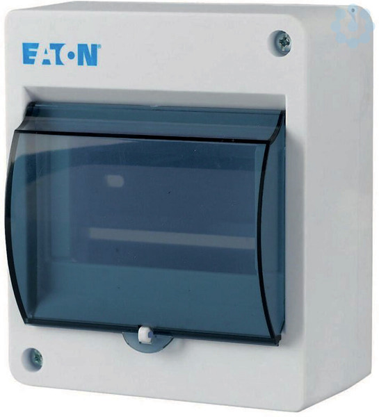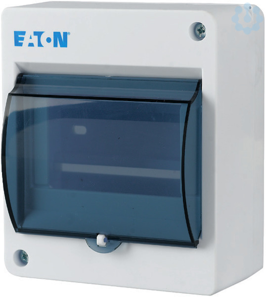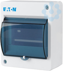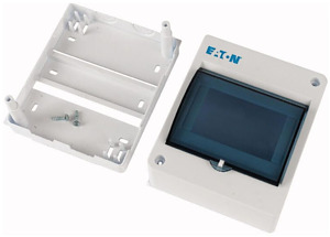 Mini Kleinverteiler aus Kunststoff, mit transparenter Tür, zum Einbau von Schalt- und Schutzgeräten nach Maßnorm DIN 43 880 mit 70 mm Einbautiefe bis 63 A, 400 V /50 Hz, Schutzart IP30 nach IEC/EN 62208, für den Bau von Installationsverteilern nach IEC/EN 61439-3 VDE 0660-600-3 zugelassen, zur Aufputz Montage, Oberteil mit 46 mm Geräteöffnung, serienmaessig plombierbar, Unterteil und Deckel weiß mit Schraubverschluß, Vorprägung für metrische Leitungseinführungen oben, unten und hinten, Schutzklasse II, 5 Teilungseinheiten.