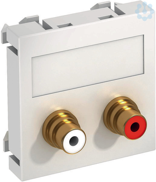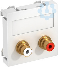 Multimediaträger mit zwei Cinch Anschlussbuchsen für Audio R / L, Kabelauslass gerade, mit Beschriftungsfeld, zwei Cinch Buchsen (RCA) mit Lötanschluss, Farbkodierung rot / weiß. Trägerplatte mit Rastbefestigung, geeignet für den waagerechten und senkrechten Einbau in die Systemumgebung.