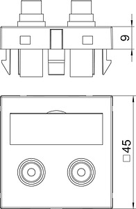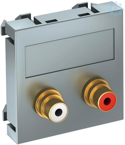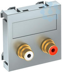 Multimediaträger mit zwei Cinch Anschlussbuchsen für Audio R / L, Kabelauslass gerade, mit Beschriftungsfeld, zwei Cinch Buchsen (RCA) mit Lötanschluss, Farbkodierung rot / weiß. Trägerplatte mit Rastbefestigung, geeignet für den waagerechten und senkrechten Einbau in die Systemumgebung.