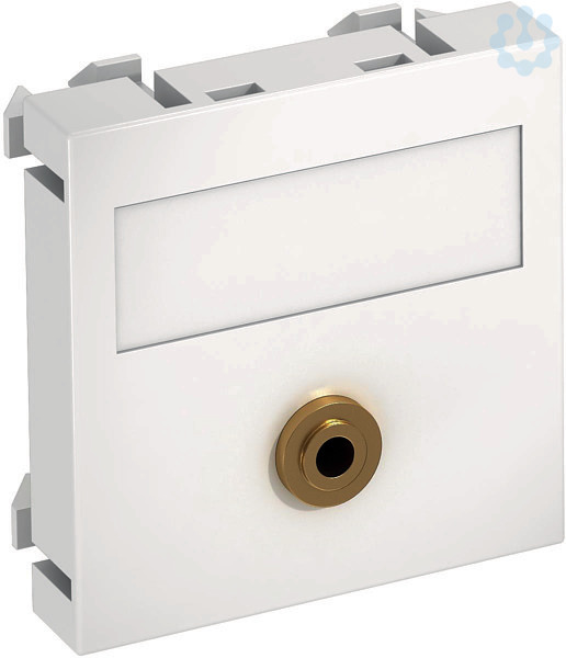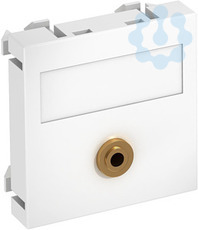 Multimediaträger mit einer Mini-Klinken-Anschlussbuchse, Kabelauslass gerade, mit Beschriftungsfeld, Mini-Klinken-Buchse (TRS 3,5 mm) mit Lötanschluss. Trägerplatte mit Rastbefestigung, geeignet für den waagerechten und senkrechten Einbau in die Systemumgebung.