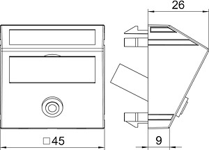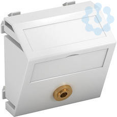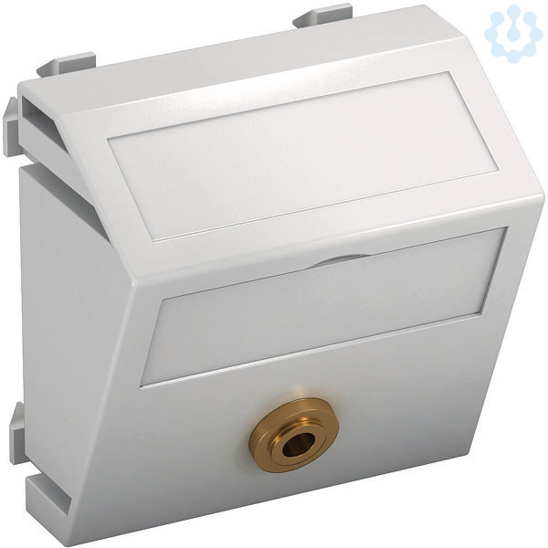 Multimediaträger mit einer Mini-Klinken-Anschlussbuchse, Kabelauslass schräg, mit Beschriftungsfeld, Mini-Klinken-Buchse (TRS 3,5 mm) mit Lötanschluss. Trägerplatte mit Rastbefestigung, geeignet für den waagerechten und senkrechten Einbau in die Systemumgebung.