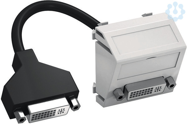 Multimediaträger mit einer DVI-I-Anschlussbuchse, Kabelauslass schräg, mit Beschriftungsfeld, kurzes DVI-I-Anschlusskabel in Ausführung Buchse-Buchse. Träger mit Rastbefestigung, geeignet für den waagerechten und senkrechten Einbau in die Systemumgebung.