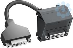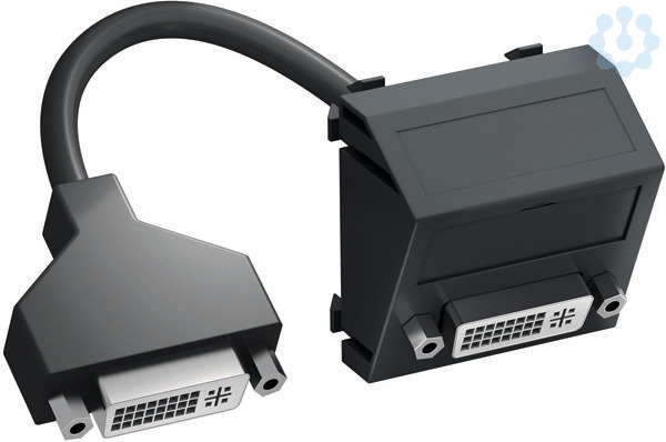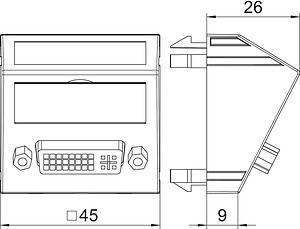 Multimediaträger mit einer DVI-I Anschlussbuchse, Kabelauslass schräg, mit Beschriftungsfeld, kurzes DVI-I Anschlusskabel in Ausführung Buchse-Buchse. Träger mit Rastbefestigung, geeignet für den waagerechten und senkrechten Einbau in die Systemumgebung.