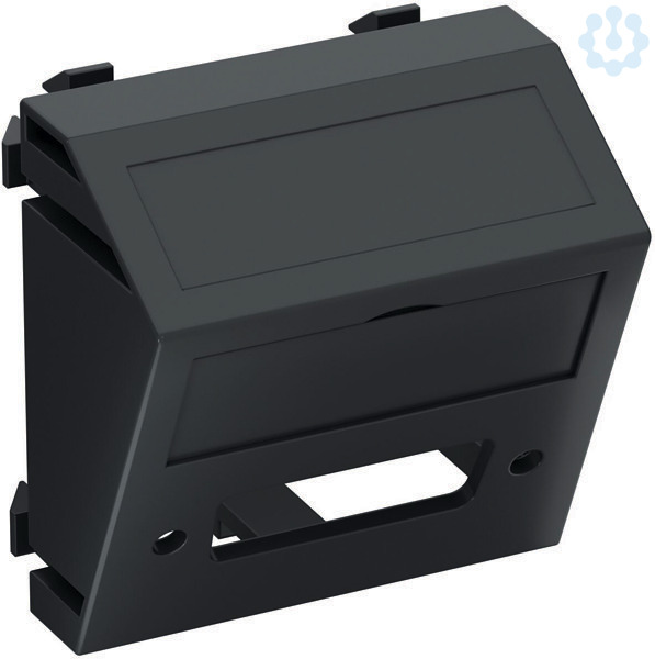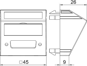 Multimediaträger für einen DVI Steckverbinder, Kabelauslass schräg, mit Beschriftungsfeld, ohne Steckverbinder. Trägerplatte mit Rastbefestigung, geeignet für den waagerechten und senkrechten Einbau in die Systemumgebung.